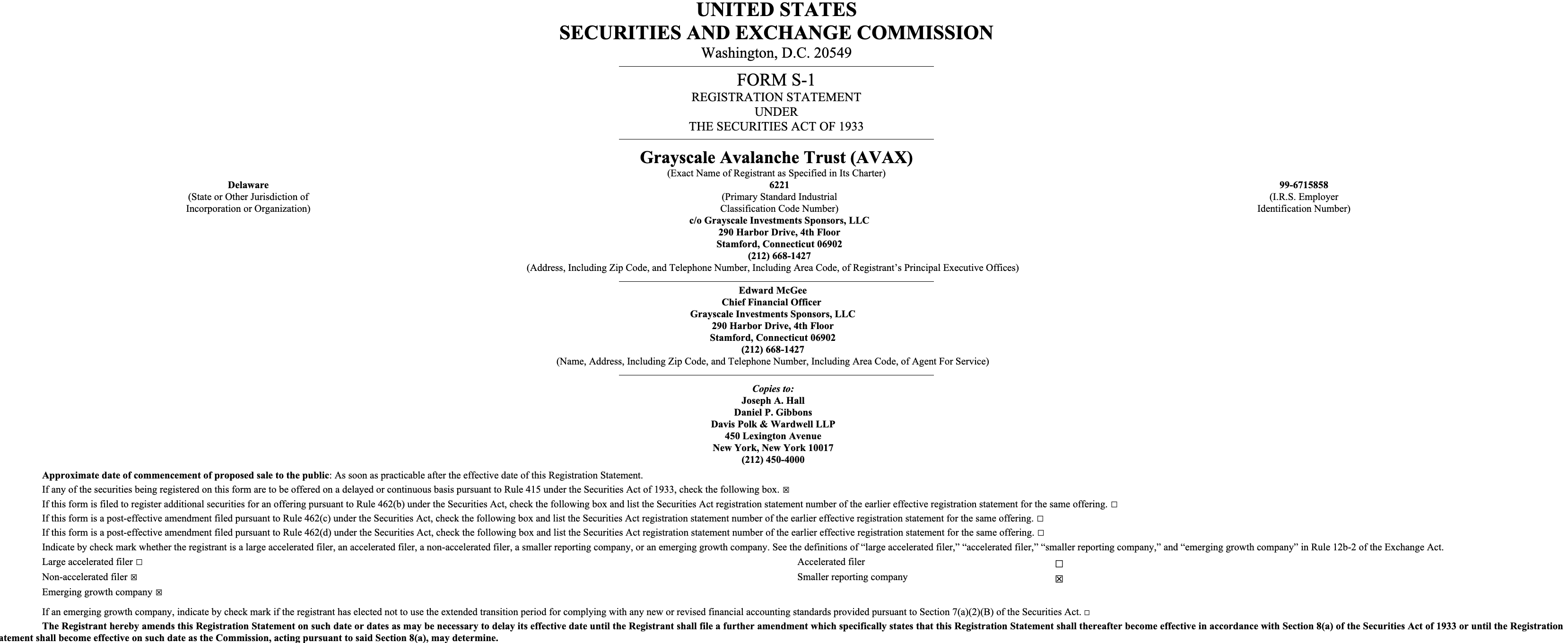 Grayscale InvestmentsGrayscale Avalanche to the US Securities and Stock Exchange Commission (SEC) on August 25 $24.40 S-1 registration declaration for Trust (AVAX) presented. According to the S-1 registration declaration submitted to the SEC, the main network of the Avalanche network will follow the price of AVAX. In case of approval from the US regulator, ETF will be listed in Nasdaq and will be opened for transactions. Coinbase Custody was assigned to the storage solution of the coins that ETF will hold on behalf of its customers, while the intermediary task was given to Coinbase.