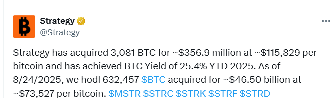 Turned into a great strategy for public companies “”Buy BTCSell the stock, let the shares rise, buy more BTC, SAT ”tactic led to an increase in the number of crypto reserve companies. Strategy (formerly former name Microstrategy), who earned tens of billions of dollars from this, announced that he had made purchases again last week. Strategy Between 18-24 August, he received 3,081 BTC.