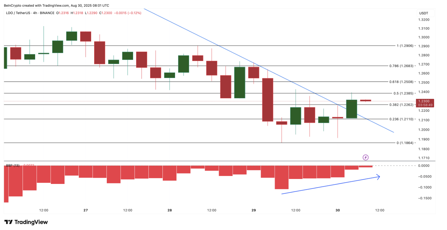 Technically, LDO came out of the descending triangle, which has suppressed the price since 23 August, and the downward trend was invalid. The BBP indicator shows that the decline power is weakened. If it permanently over $ 1.26, $ 1.29 can be tested. However, if the price falls below $ 1.21 again, the expectations of recovery will weaken. If the entire rise scenario is invalid under $ 1.18.