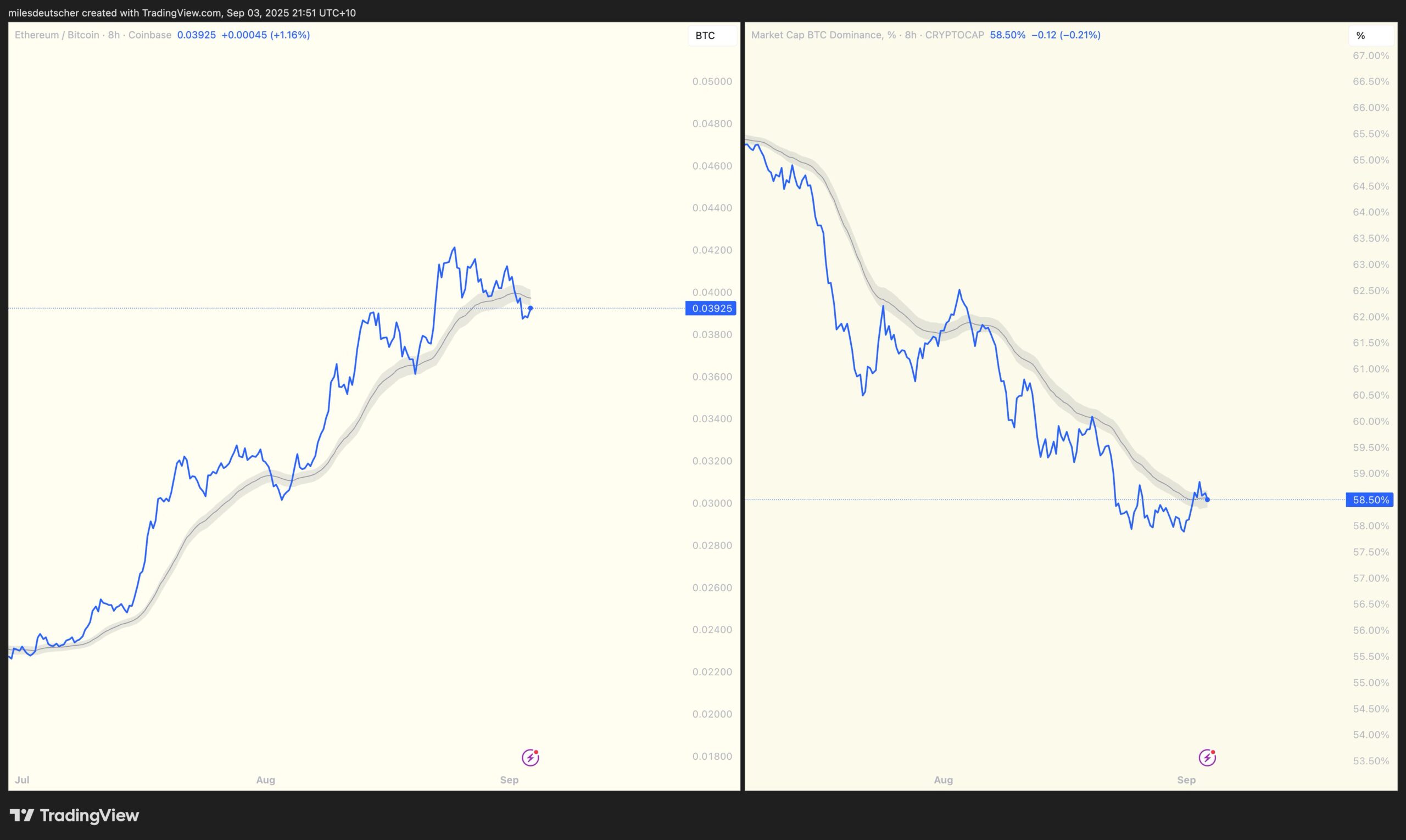 Miles deutscher focuses on two graphs. These ETHBTC And BTC Market domination graph. While the ETHBTC parity declines, the reversal of the market domination of the BTC is associated with the rise of gold. Recently, the price of golden gold that broke new records is preparing for the upcoming interest rate cuts. This week, we have seen evaluations that BTC and Gold can be considered this week.