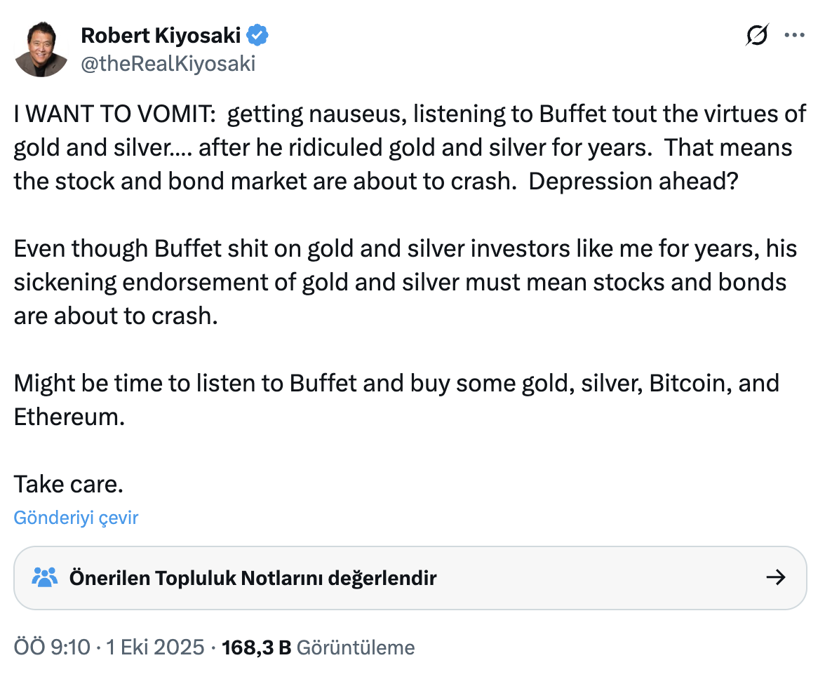 Robert KiyosakiWarren Buffett’s messages focused on precious metals, referring to investors to buy Bitcoin, Ethereum, Gold and Silver. Famous writer X In his latest sharing from his account, he drew attention to the possibility of collapse with harsh fluctuation in the stocks and bond markets. Pointing to the change in the approach of the founder of Berkshire Hathaway, Kiyosaki suggested that the portfolios be re -balanced for risk protection.