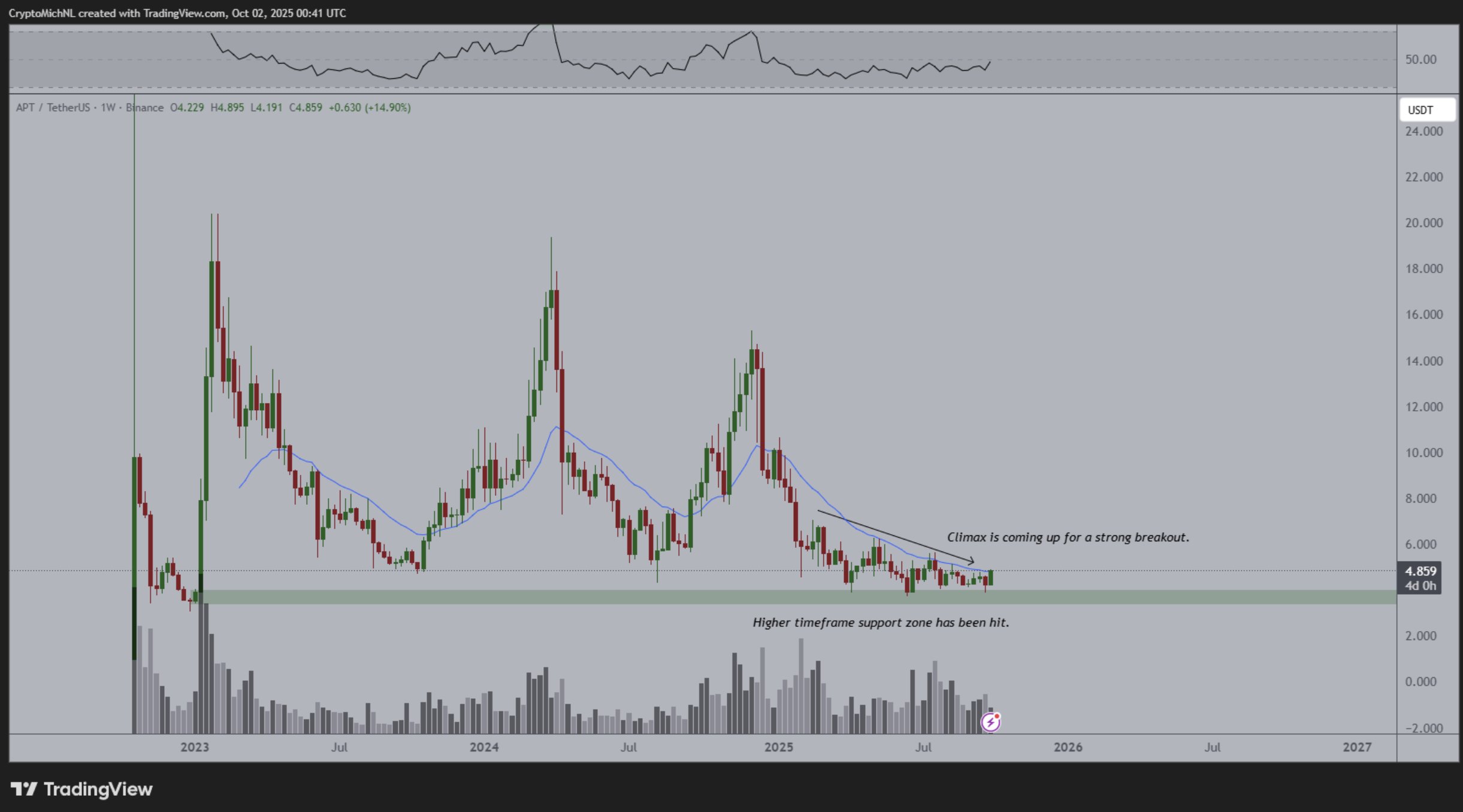 Michael Poppe, who pumps the hope of more rise to investors APTOS (APT) Coin “Now on the brink of breaking,” he said. This week there is a Token 2049 event, and during such rise periods, such activities turn into scenes where partnerships that want to influence the graphics are announced.
