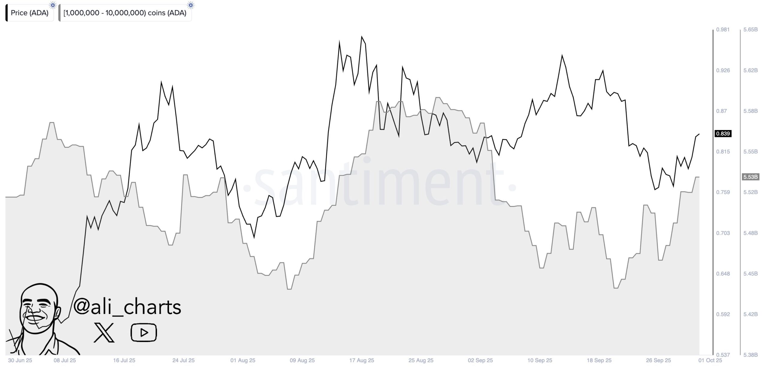 In the focus of Ali Martinez again Ada Coin there is. The price exceeded $ 0.83 and targets $ 0.93, but remained weak compared to other subcoins. Martinez argues that whales, which received 70 million island coins in the last week, are preparing for the upcoming rise.