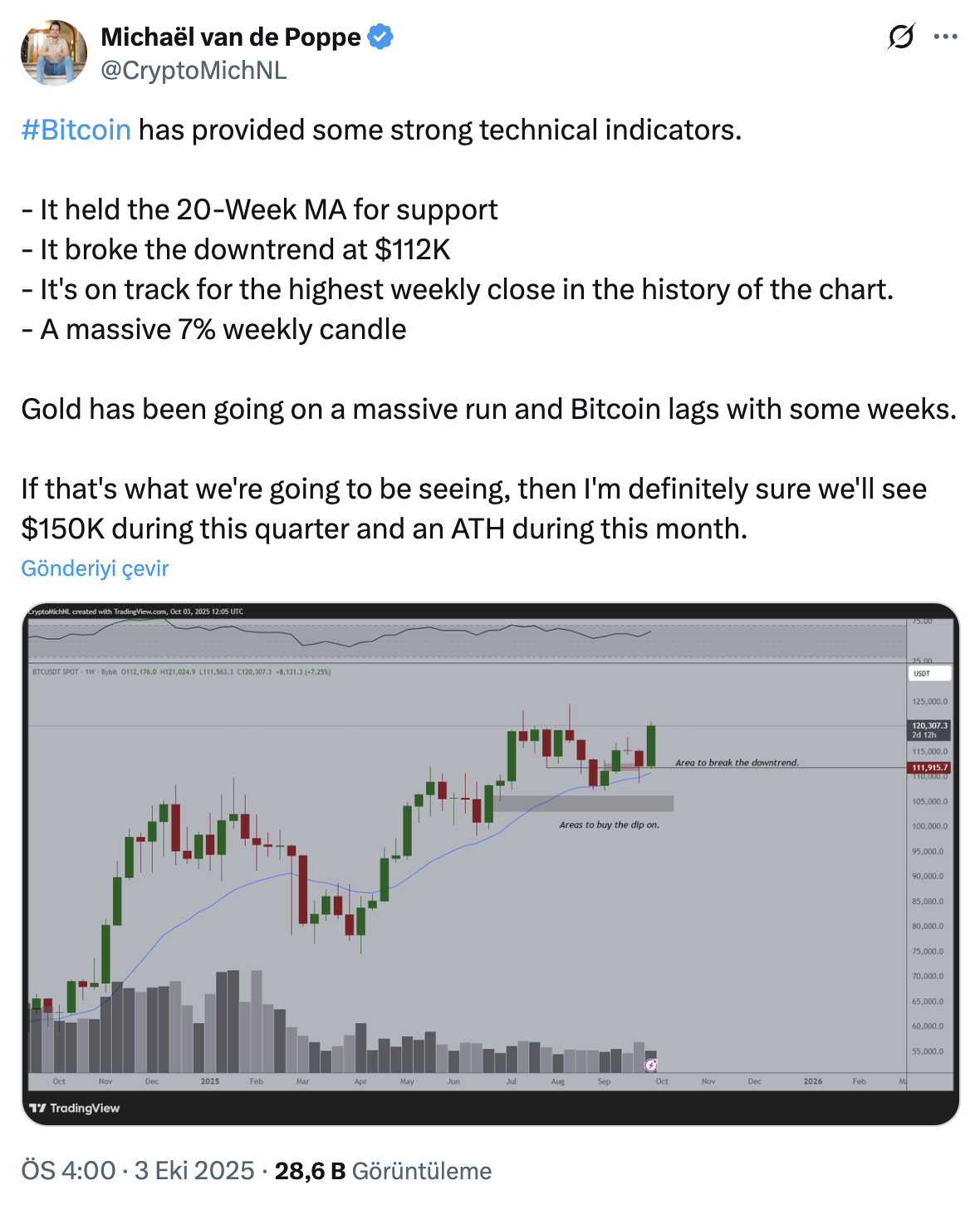 Market expert Michael van also poppeThe support of the 20 -week moving average by support, over 112,000 dollars to overcome the falling trend and preparing for the highest weekly closing of history is in favor of rise. The last week has shown that about 11 percent of the powerful wax momentum confirmed. The rally in precious metals offers a ground that supports the risk appetite through the correlation channel.