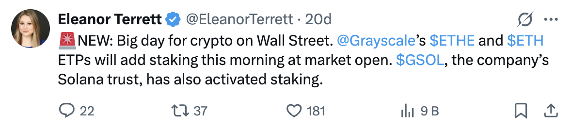 According to the press release of Grayscale Ethe And Eth ETPs and GSOL’s structure have been updated to integrate the stinging gains obtained in exchange for participation in the network verification into the product mechanism. The structure enables the investor to be reflected in the share of the investor after the costs are deducted.