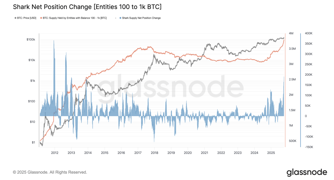 According to the information shared by data analysis platform Glassnode, “shark” investors holding assets between 100 and 1,000 BTC bought aggressively after the liquidation. The daily net position change of this wallet group reached 190,296 BTC, the highest level since September 2012.