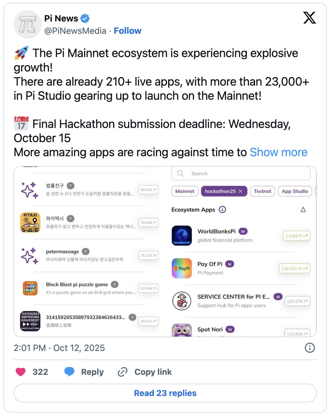 Pi NetworkWhile discussions continue in , ecosystem data shows that momentum has been gained again. According to Pi News, one of the major channels focusing on the project in X, the number of live applications has exceeded 210. The number of projects prepared for the main network exceeded 21,000. The developer pace, which accelerated with the hackathon at the end of August, became more visible as the October 15 deadline approached. The team highlighted the most used new applications in the interim evaluation published in September.