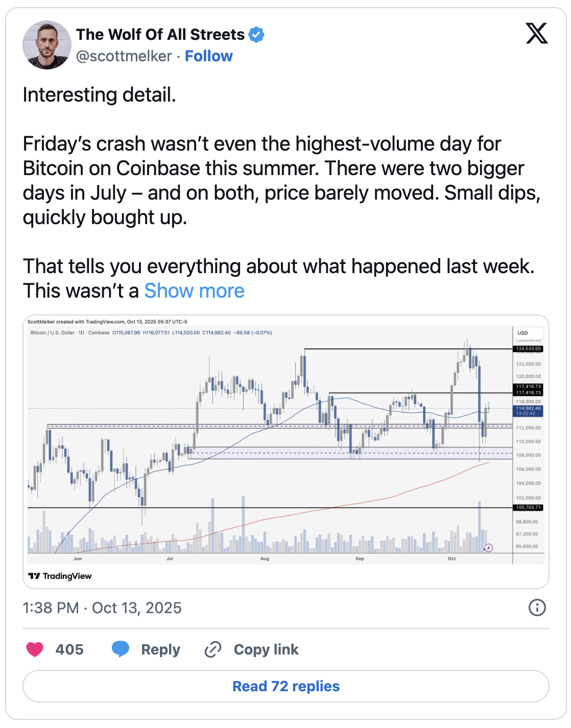 Wolf of All Streets podcast host Scott Melkel made a remarkable point in his post based on Coinbase data. According to Melkel, the sharp decline experienced by Bitcoin on Friday was not the highest volume day of this summer. Two days in July saw much higher transaction volumes; yet the price had barely moved. He stated that this situation revealed that the recent decline was a “leverage collapse” rather than a broad-based panic selling.
