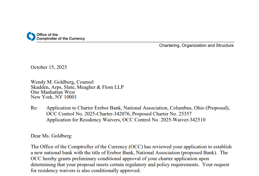 “Erebor is the first new bank to receive preconditional approval since I came to the OCC. I am committed to a dynamic and diverse federal banking system, and the decision we made today is a first but important step toward fulfilling that commitment.”