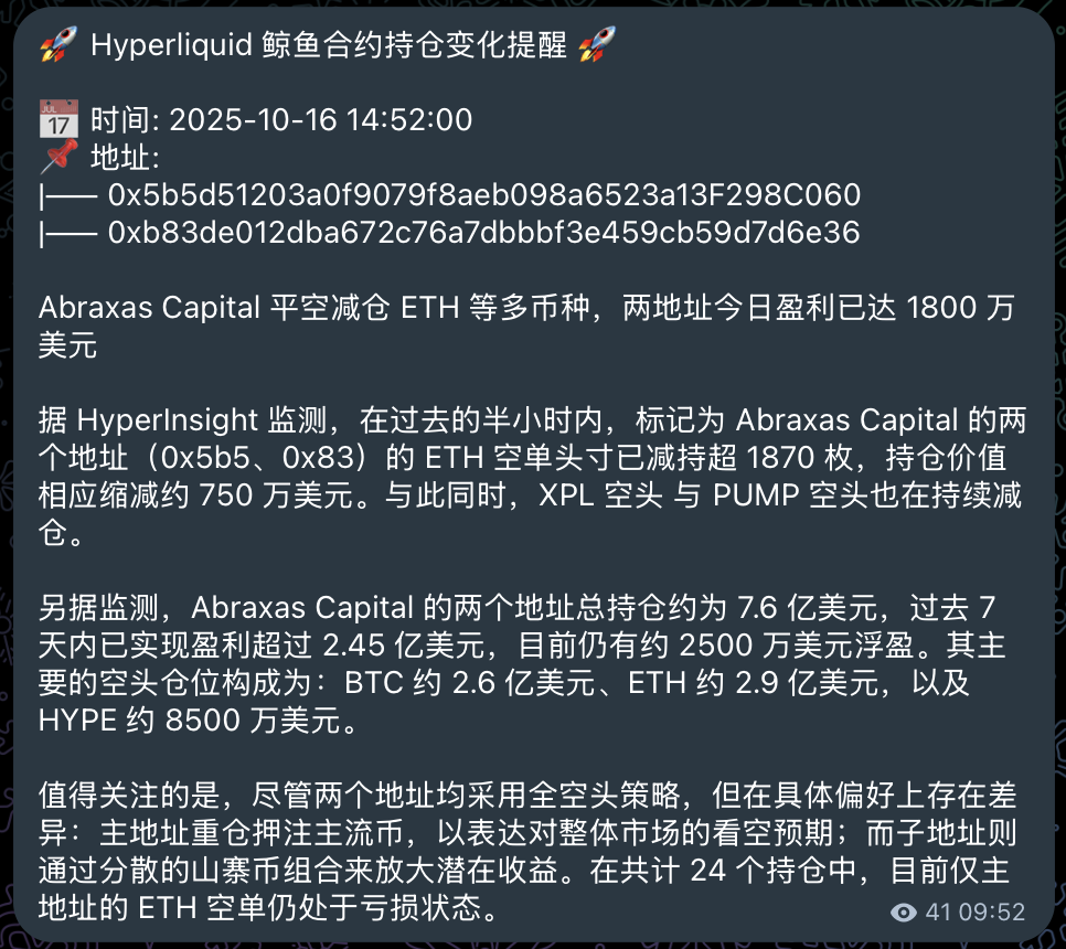 cryptocurrency fund Abraxas CapitalEthereum (ETH) following recent market volatility $3,999.65 and pocketed a significant profit by partially closing short positions in various altcoins. According to HyperInsight data, on October 16, in the last two hours alone, a total of 1,870 ETH positions were closed from the fund’s two wallets (0x5b5… and 0x83…). With this transaction, the open position value of the fund decreased by approximately 7.5 million dollars. In the same period XPL And PUMP Gradual position reduction was also observed in the contracts.