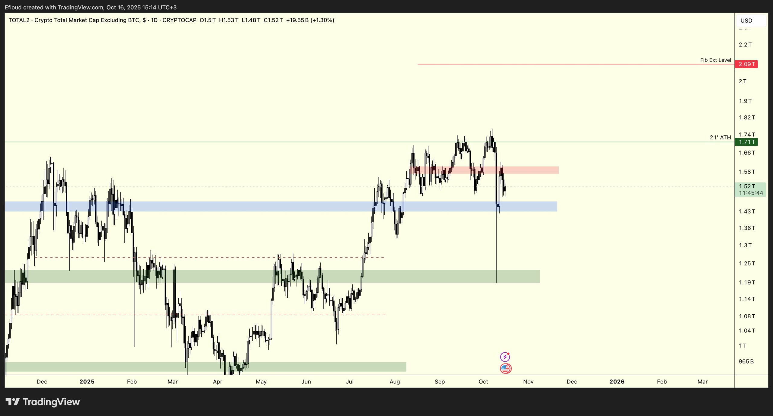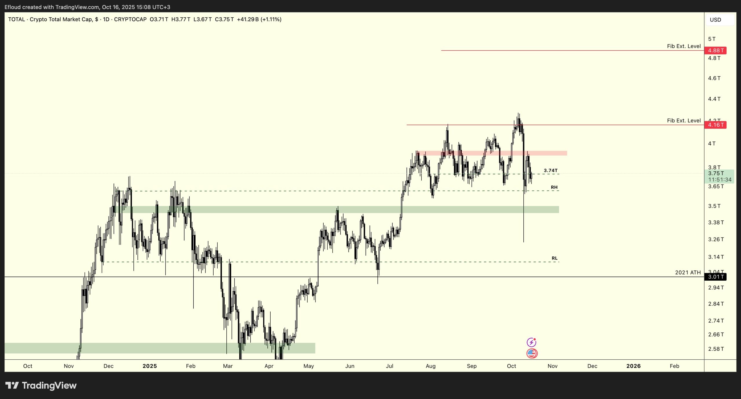 Anonymous company known for accurately detecting important price zones cryptocurrency analyst Efloud shared his comprehensive assessment hours ago. The analyst who shared the total market value chart of cryptocurrencies during the decline on October 11 expected around $3.4 trillion to be maintained as support. According to Efloud, the recovery of $ 3.74 trillion will bring up the resistance of $ 3.95 trillion.
