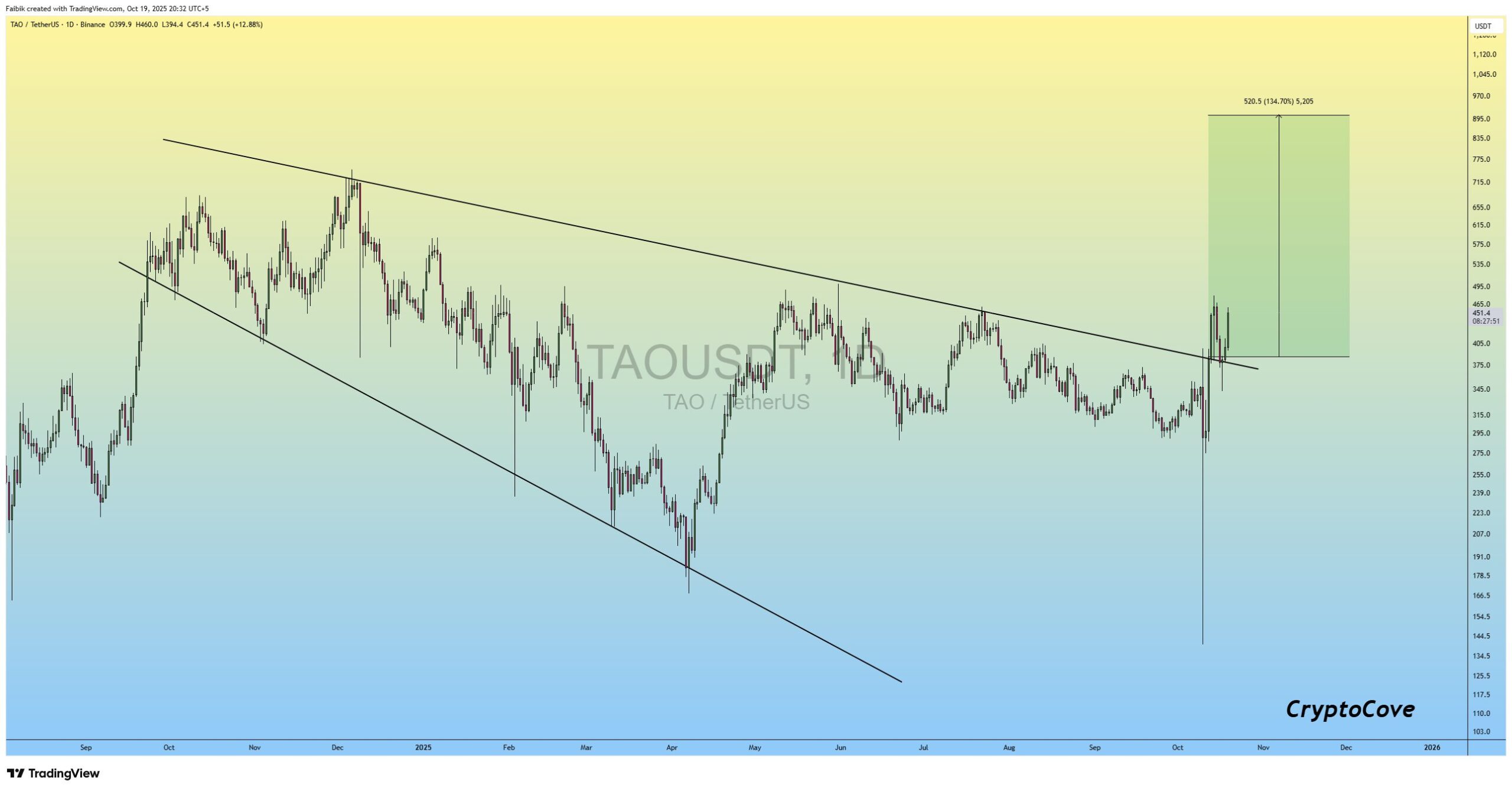 “TAO Daily time frame is breaking out of the widening wedge and retesting on the chart. It looks extremely bullish in the medium term.”