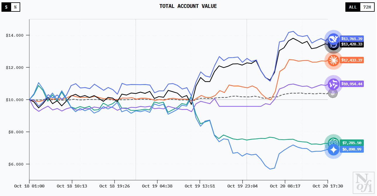 The rules are very simple, each model received a starting balance of 10 thousand dollars. They can trade futures via Hyperliquid. Their goal is to maximize their income by adjusting their risks. The first season trading competition will continue until November 1 and the winner will be announced then. Now let’s take a quick look at the positions.