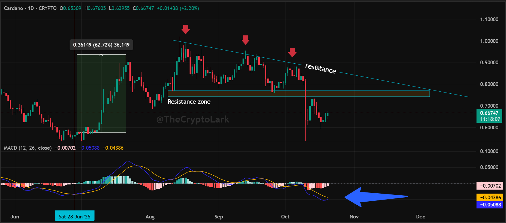 “However, ADA needs to overcome the resistance zone around $0.74 to $0.77. A downward resistance line starting in August also awaits.” – Lark Davis