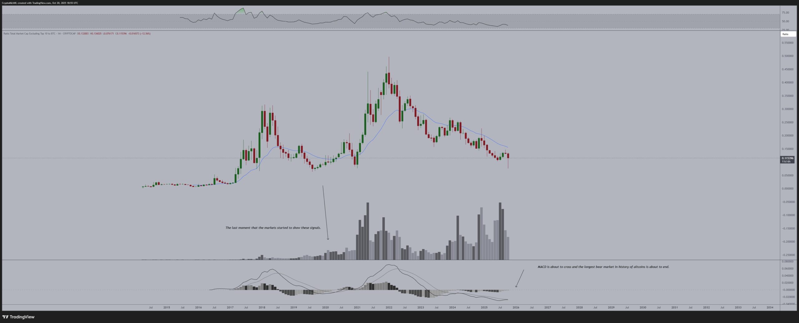 Michael Poppe wrote exactly this and argues that comparing the market cap of altcoins with BTC tells us a lot. It may be useful to examine this chart in the longer term to understand the cycle stages. And if Poppe is right, we are still in the beginning stages of bull markets, meaning a period of great rise awaits us.