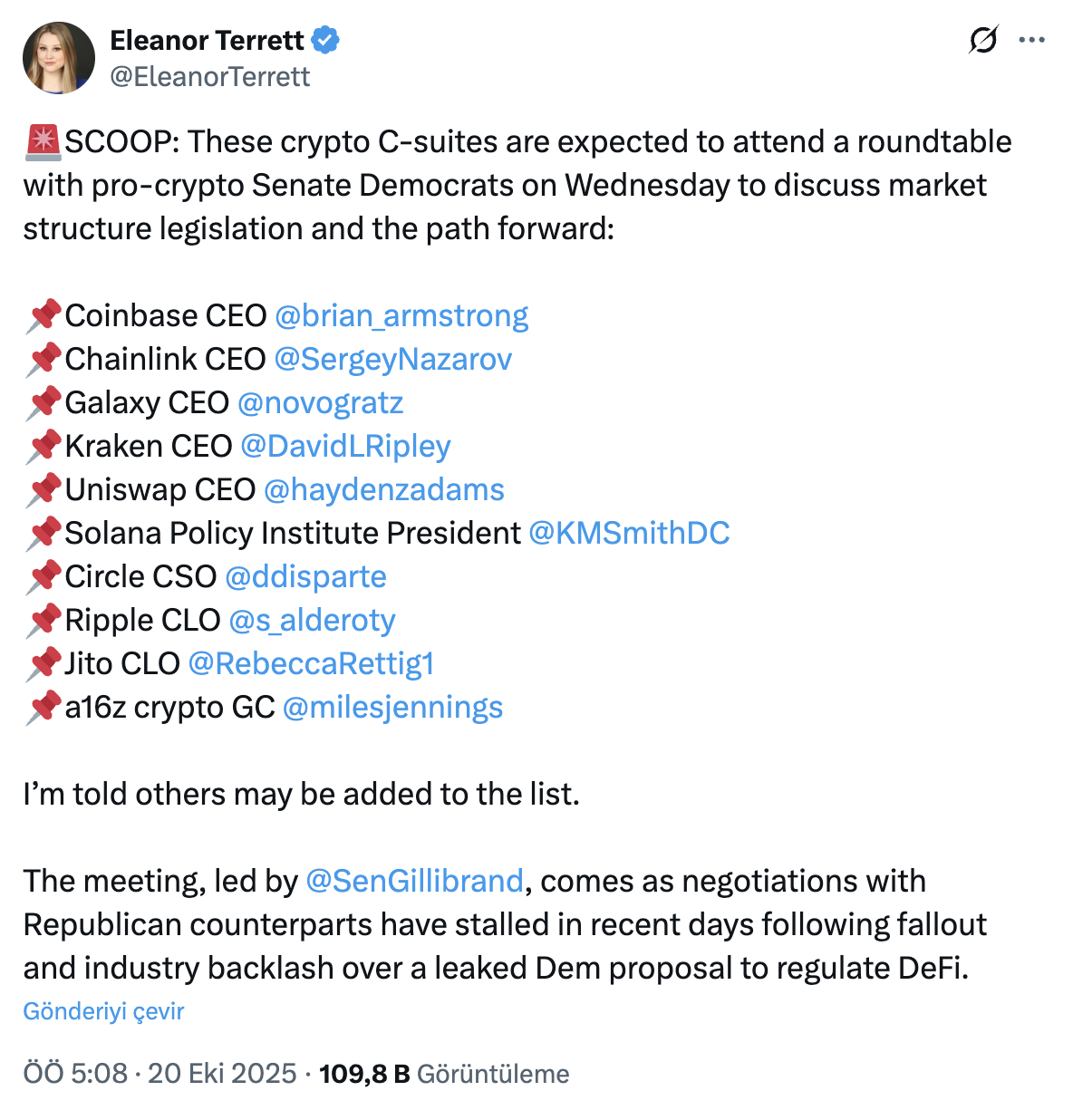 Fox Business journalist Eleanor Terrett‘s dated 20 October X According to the post, the meeting was attended by Coinbase CEO Brian Armstrong, Chainlink founder Sergey Nazarov, Galaxy’s Mike Novogratz, Kraken CEO. Dave Ripley and founder of Uniswap Hayden Adams will attend. President of Solana Policy Institute at the meeting Kristin SmithRipple legal director Stuart AlderotyCircle CSO Dante Disparte and a16z’s cryptocurrency legal advisor Miles Jennings Policy makers such as will also take part.