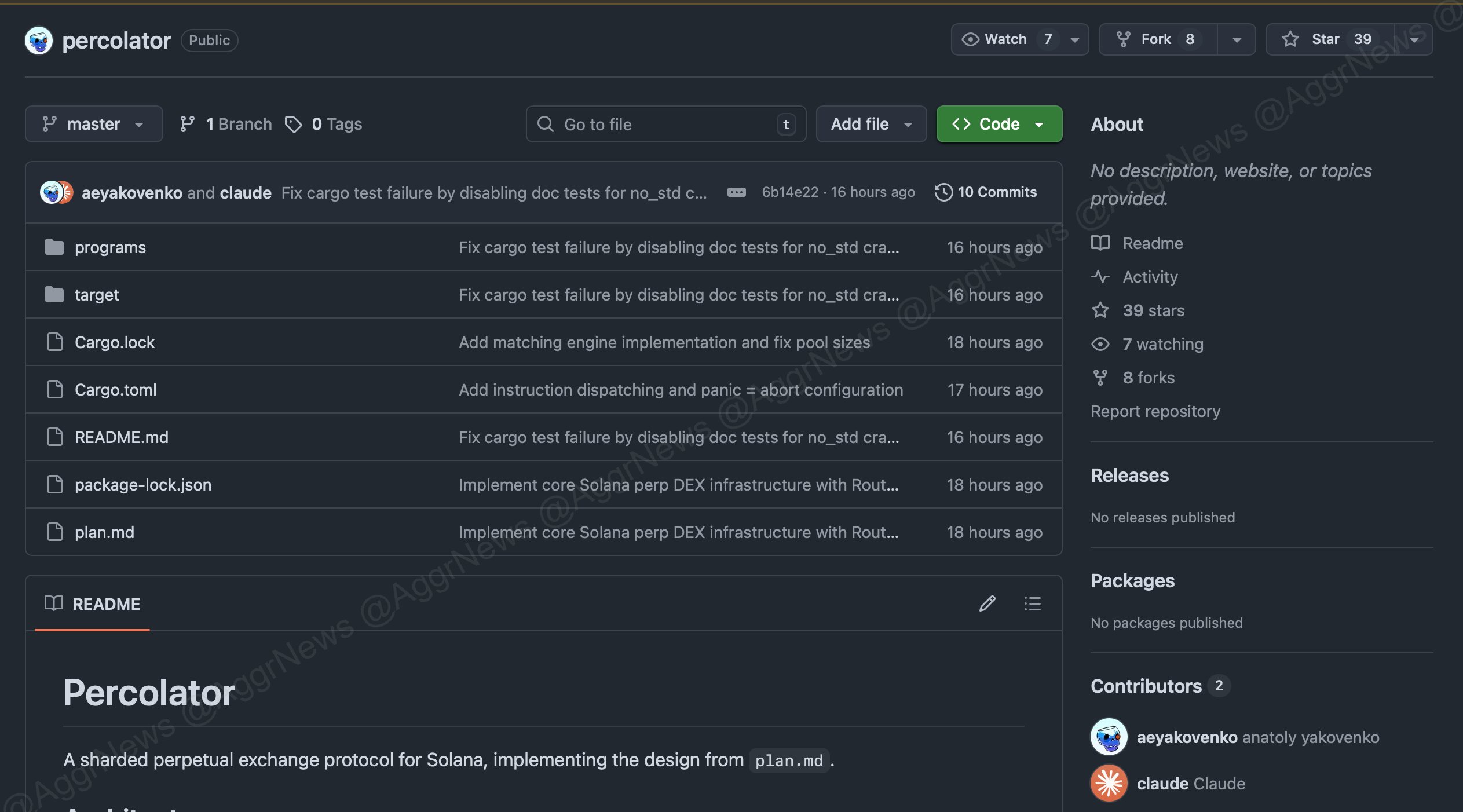 The project is called Percolator and is imagined as an Aster-like DEX that will run on the Solana network. Chief among the contributors are Anatoly and Claude. Active commits were made 16–18 hours ago; So the project seems to have just started and is still at an early stage. Since there is no official release or deployment, users may not be able to start testing it in a few months.