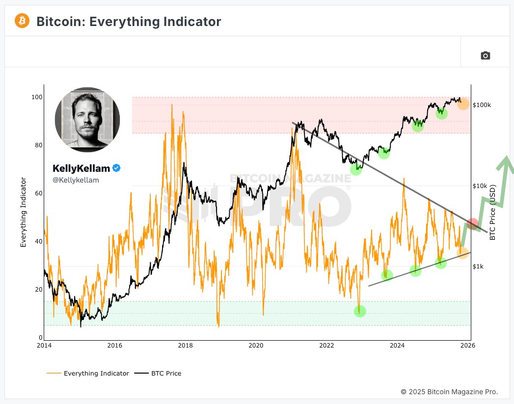 Looking at the Bitcoin Everything indicator, Kelly Kellam says something else by looking at on-chain metrics. According to him, the on-chain metric is stuck at the decision point. If the 4-year cycle has ended, this is a squeeze signal. cryptocurrency It will be remembered as the harbinger of a big boom in the markets.