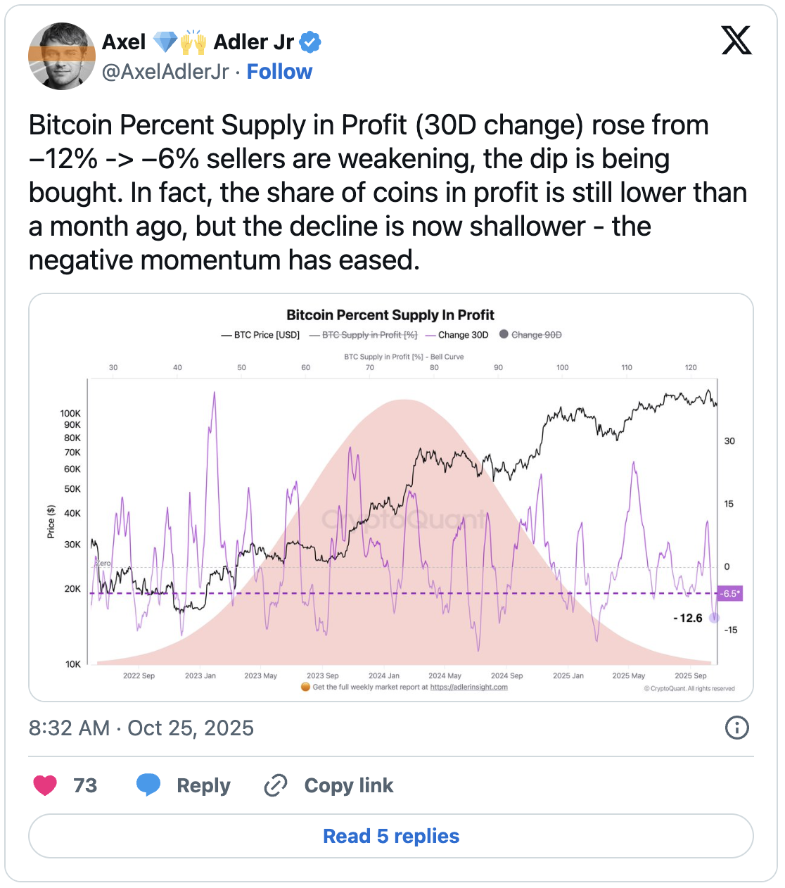 According to on-chain analyst Axel Adler, Bitcoin’s “in-profit supply ratio” has declined significantly in recent weeks. This ratio shows how much profit investors can make at the current price level. Adler stated that the amount of Bitcoin purchased below the current price has decreased in the last 30 days. This shows that investors’ desire to sell at a loss has decreased and the selling pressure in the market has weakened.