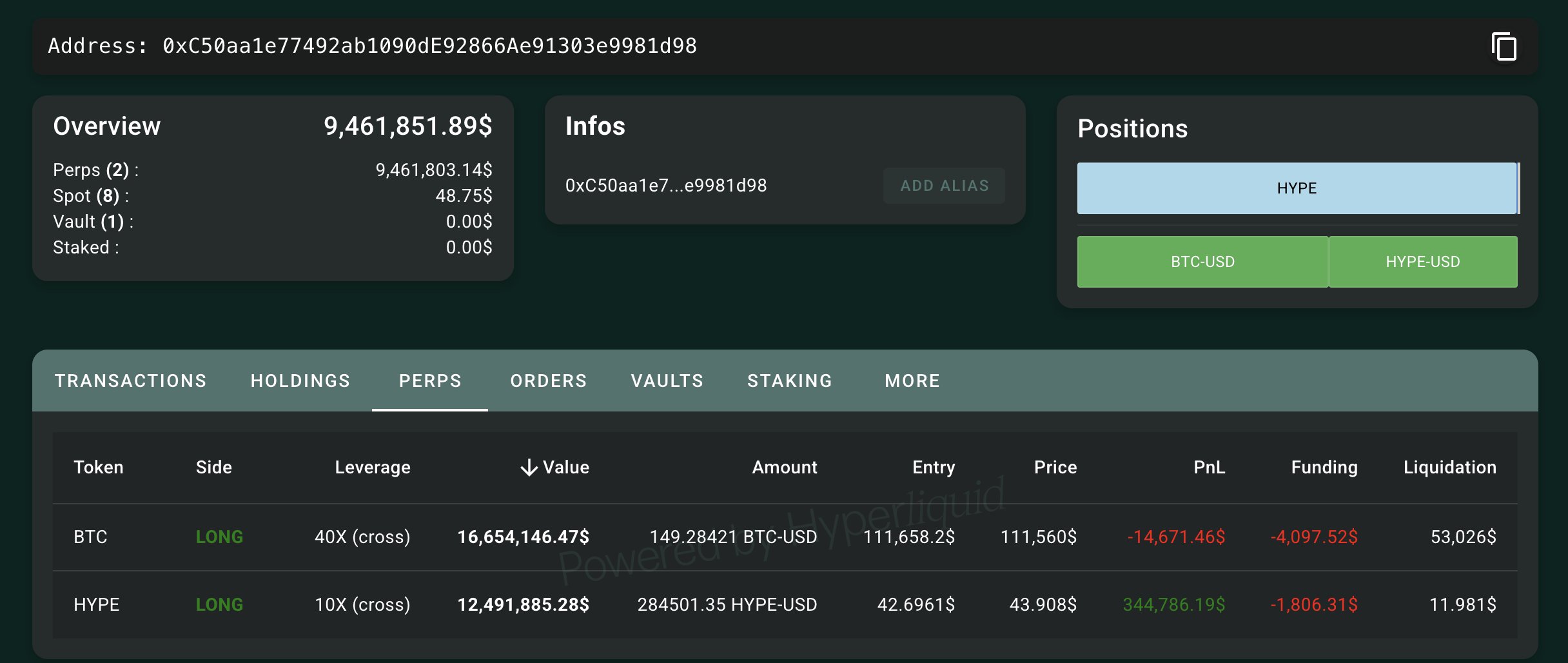 In-blockchain analytics platform lookonchainAccording to data from , the whale movement in question was considered a strong signal of confidence in the market. In the same period hyperliquid Another anonymous investor on the decentralized futures exchange called $ 16.6 million with 40x leverage. Bitcoin long position opened. The same address also took a long position of $12.5 million with 10x leverage for the platform’s main network asset, HYPE coin.