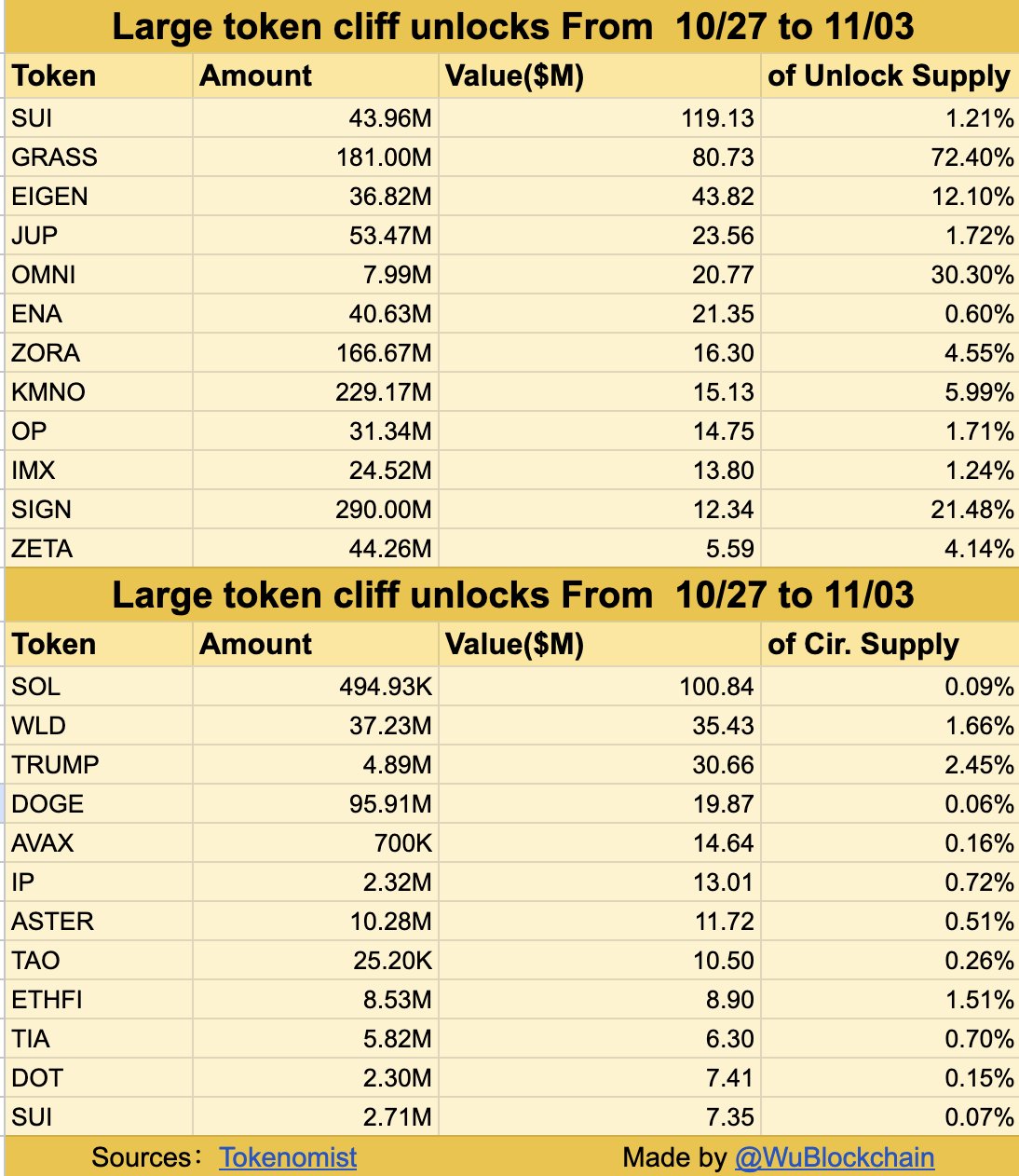 Blockchain journalist Wu Blockchain hosted by Tokenomist to data The table compiled according to the seven-day period from October 27 to November 3 SUIIt shows that 43.96 million coins with a market value of $119.13 million will be unlocked. GRASS will release 72.4 percent of its supply to the market with the unlocking of 181 million coins. EIGEN, JUP, ENA And ZETA Millions of dollars worth of coins will be unlocked in projects such as.