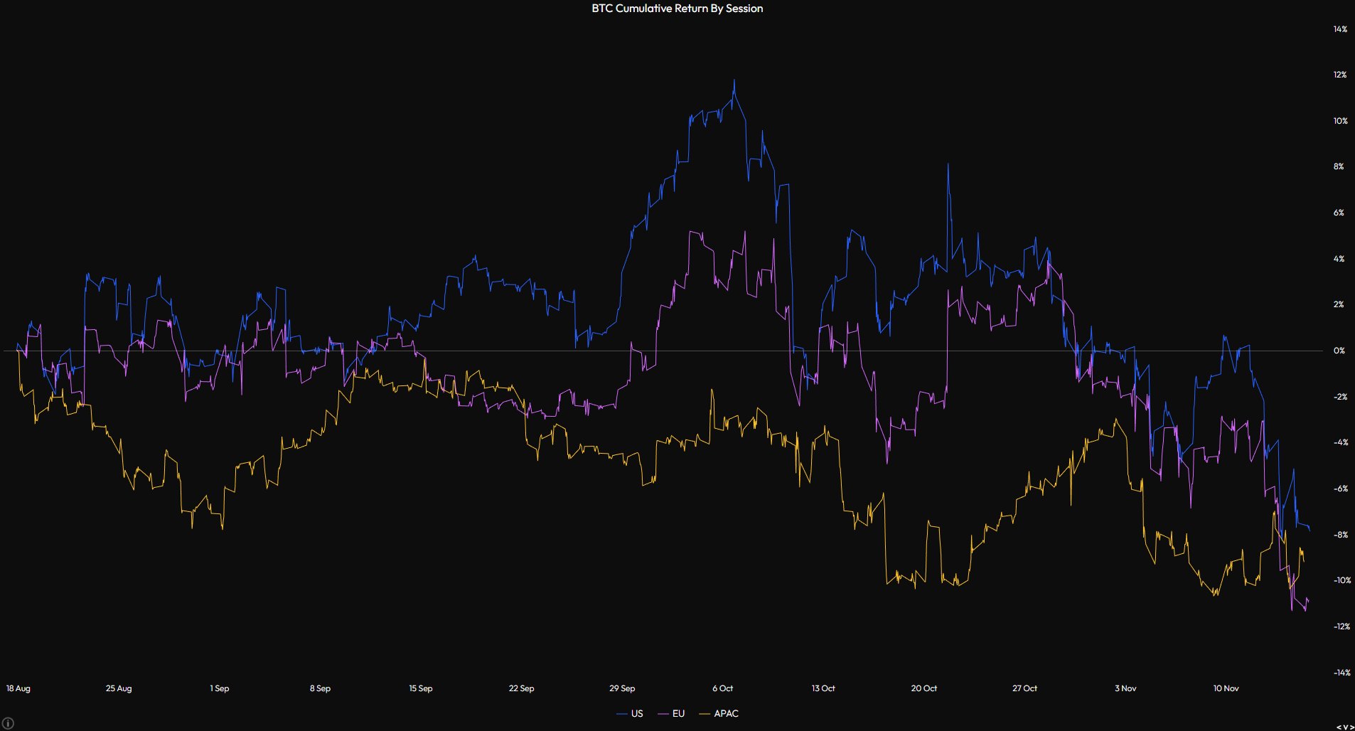 “While the main reason for BTC’s all-time high in October was the US Trading Sessions and US investors, they are also the main reason for the recent sell-offs. Most of the declines occur during the US and EU sessions.