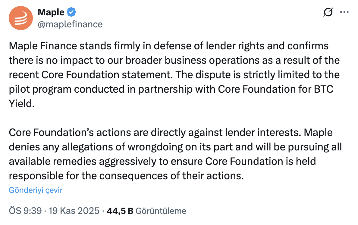 While Core stated that the legal measures it took were mandatory to protect its ecosystem and investors, it announced that it would continue to develop similar products with new collaborations. Maple Finance is X In his statement on his account, he announced that he would use all legal remedies, claiming that the dispute was limited only to the BTC Yield pilot program carried out with the Core Foundation, that its general activities were not affected, and that Core acted against the interests of the lender.