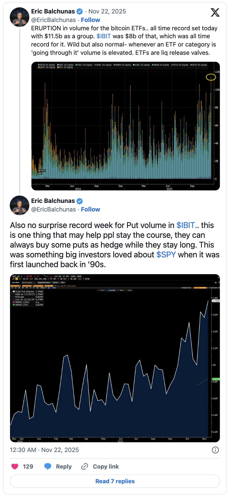Bloomberg senior ETF analyst Eric Balchunas called the total trading volume of $11.5 billion across all spot Bitcoin ETFs “an explosion.” Balchunas stated that such volume increases should be considered normal as ETFs act as liquidity relief valves during volatile periods. The largest Bitcoin ETF, IBIT, was the busiest product of the day with $8 billion, taking the lion’s share of the volume.