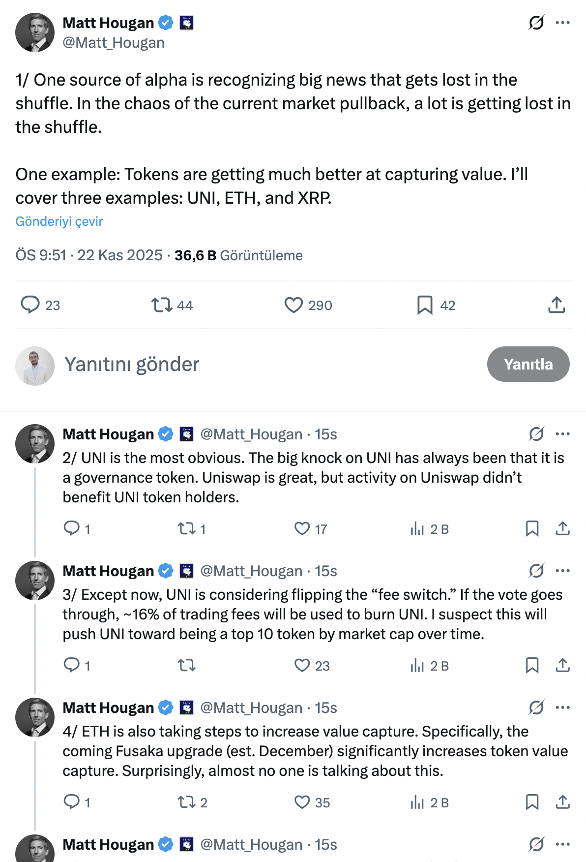 $0.004518 He emphasized that new economic models seen in projects such as (XRP) have begun to directly benefit coin owners. Thanks to the fee switch mechanism introduced in Uniswap, approximately 16 percent of transaction fees are reduced. UNI coin He said that it can be used for burning, which will strengthen the coin economy. Along the same lines, he suggested that Ethereum’s on-blockchain revenues could increase 5 to 10 times with the Fusaka update.