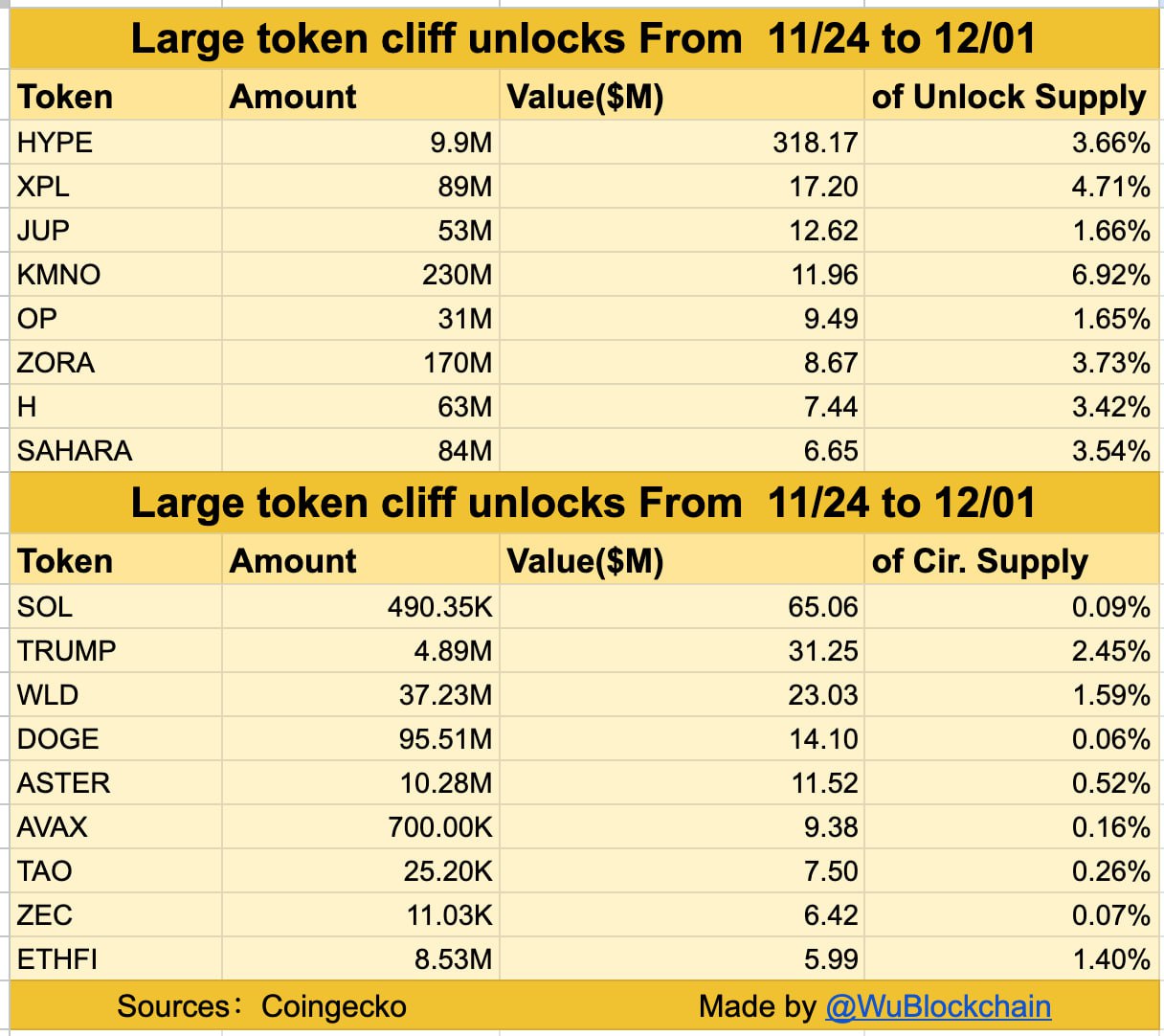 cryptocurrency market The next seven days will see major coin unlocks with a total value exceeding $566 million. According to data compiled by blockchain journalist Wu Blockchain from CoinGecko, the one-time lock openings worth over $5 million include HYPE, XPL, JUP, KMNO, OP, ZORA, H and SAHARA coins. On the other hand, linear lock openings exceeding $1 million on a daily basis are SOL, TRUMP, WLD, DOGE, ASTER, AVAX, TAO, ZEC and ETHFI. coinIt will take place in .