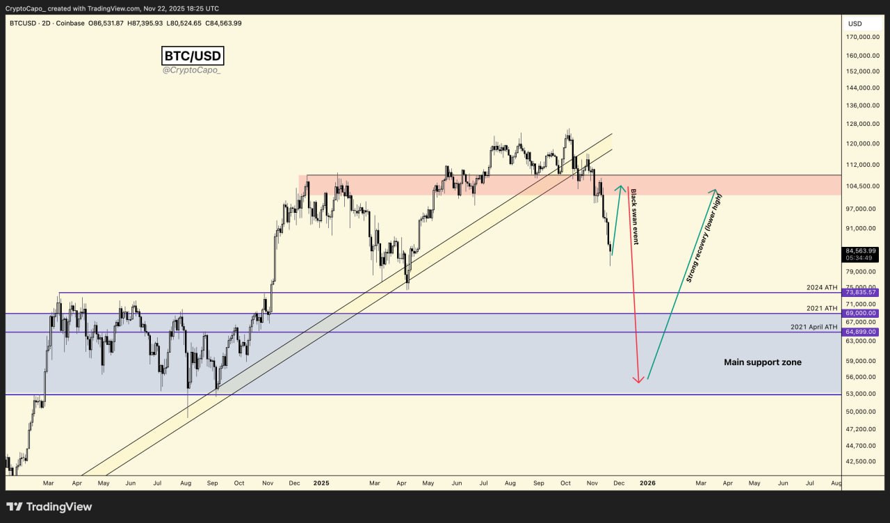 In his evaluation yesterday, Capo shared the chart below and wrote that we could see a return close to 105 thousand dollars. This is a very ambitious prediction because it expects a subsequent decline extending to the main support level at $53,000.