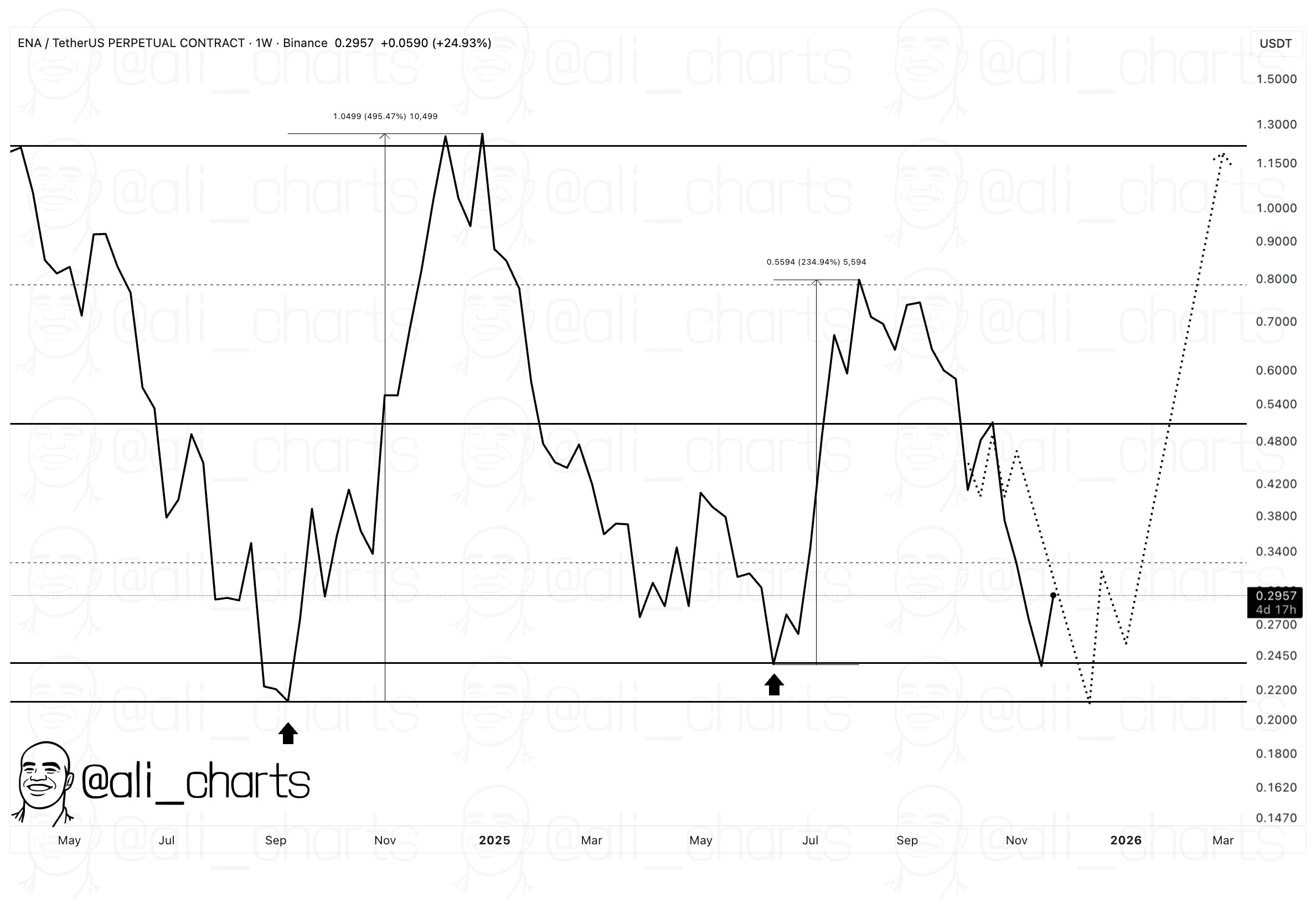 twice so far ENA Coin Drawing attention to his V-type recovery, Ali Martinez thinks that the third one may start soon. Of course, for this to happen, BTC needs to pause its decline and BTC.D needs to relax. Although the $ 85,500 support is maintained for now, we do not know what awaits us until Sunday. It is unclear how much the volume will weaken during the holiday period and the possible effects of this weakening.