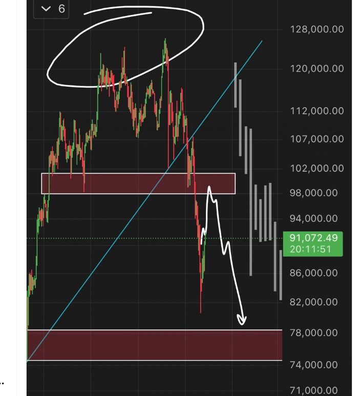 still more decline forecast The analyst predicts that a sharp selling wave may start above $98,000 and then the price will test $78,000. He doesn’t have a globe that shows the future, so you should be cautious.