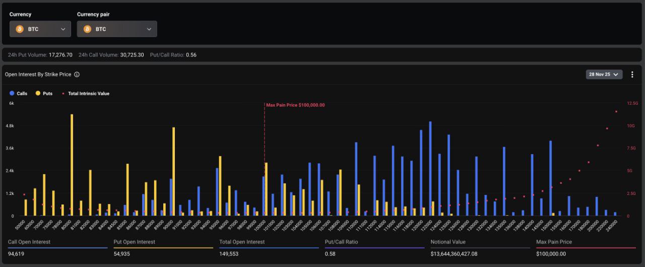 BTC: P/C 0.58, maximum pain $100,000 – call-heavy structure and post-expiration positioning look much clearer. “Now that this period has passed, it looks like early December will be quieter unless new catalysts emerge.”