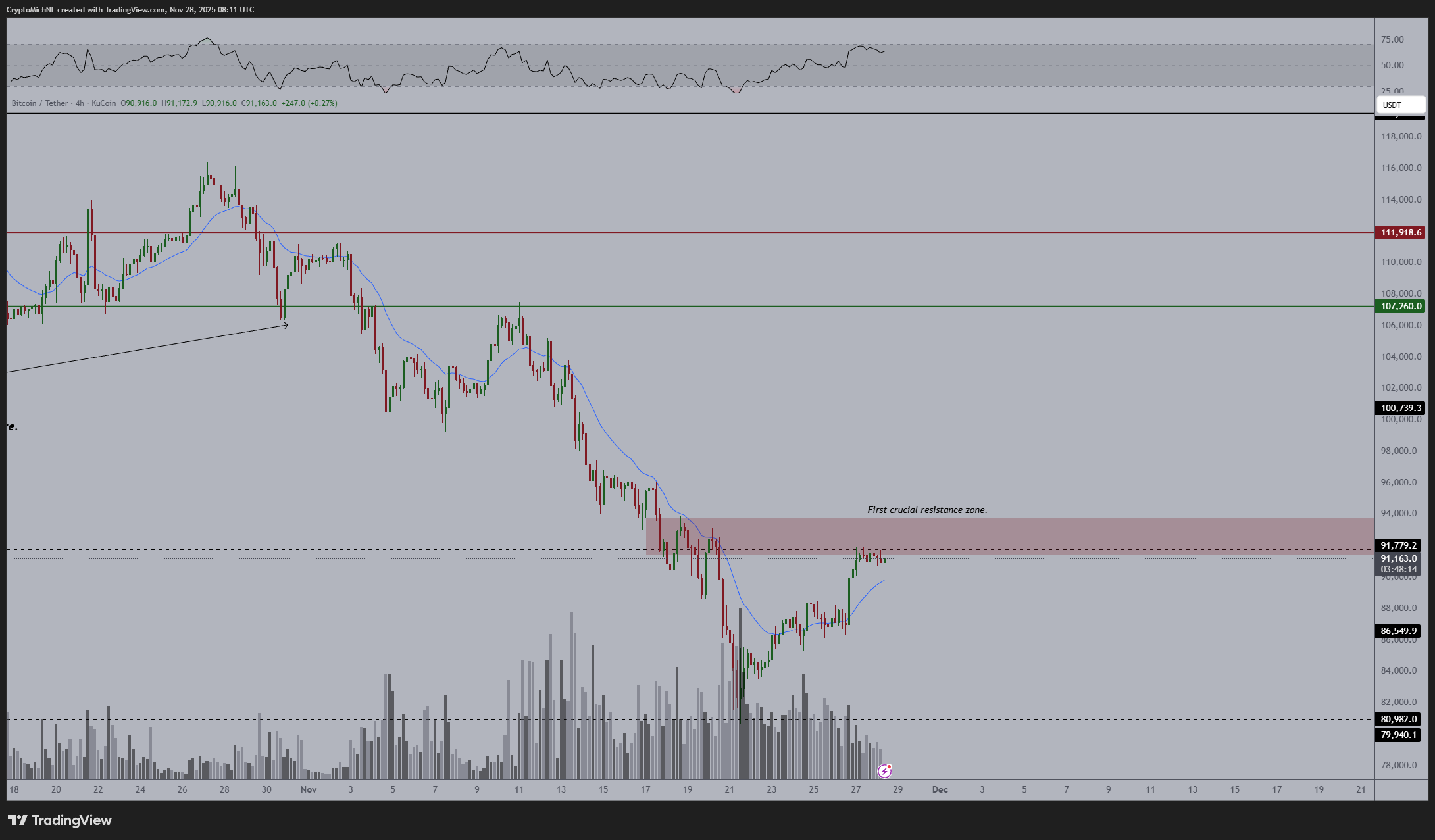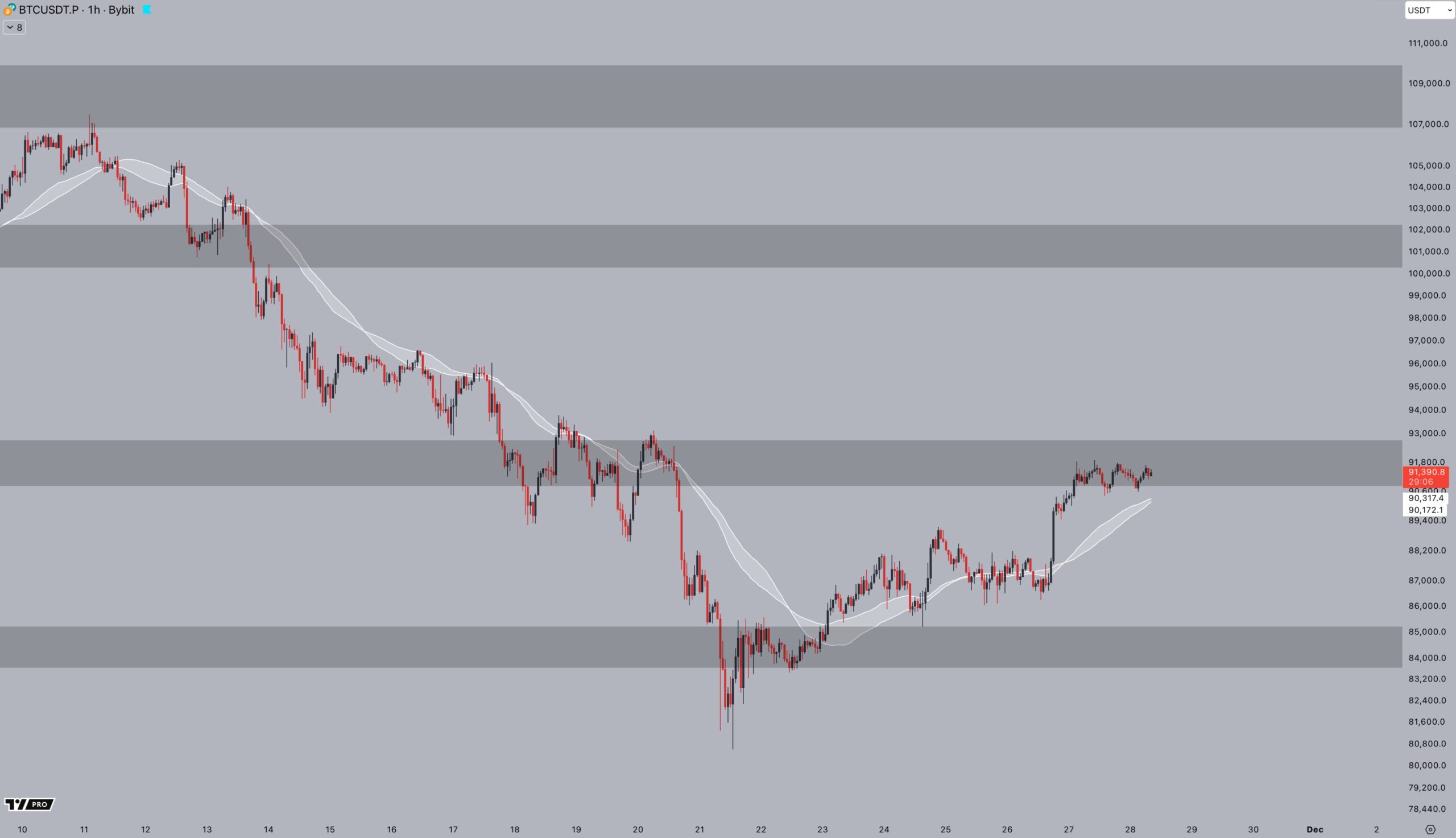 $91,474.18It is consolidating below the $91-93K resistance level and is performing well. The short-term trend remains upward, it will be interesting to see what today brings. US markets will reopen for just a few hours today (9:30-13:00 EST). “It would be great if we could overcome resistance in this time frame.”