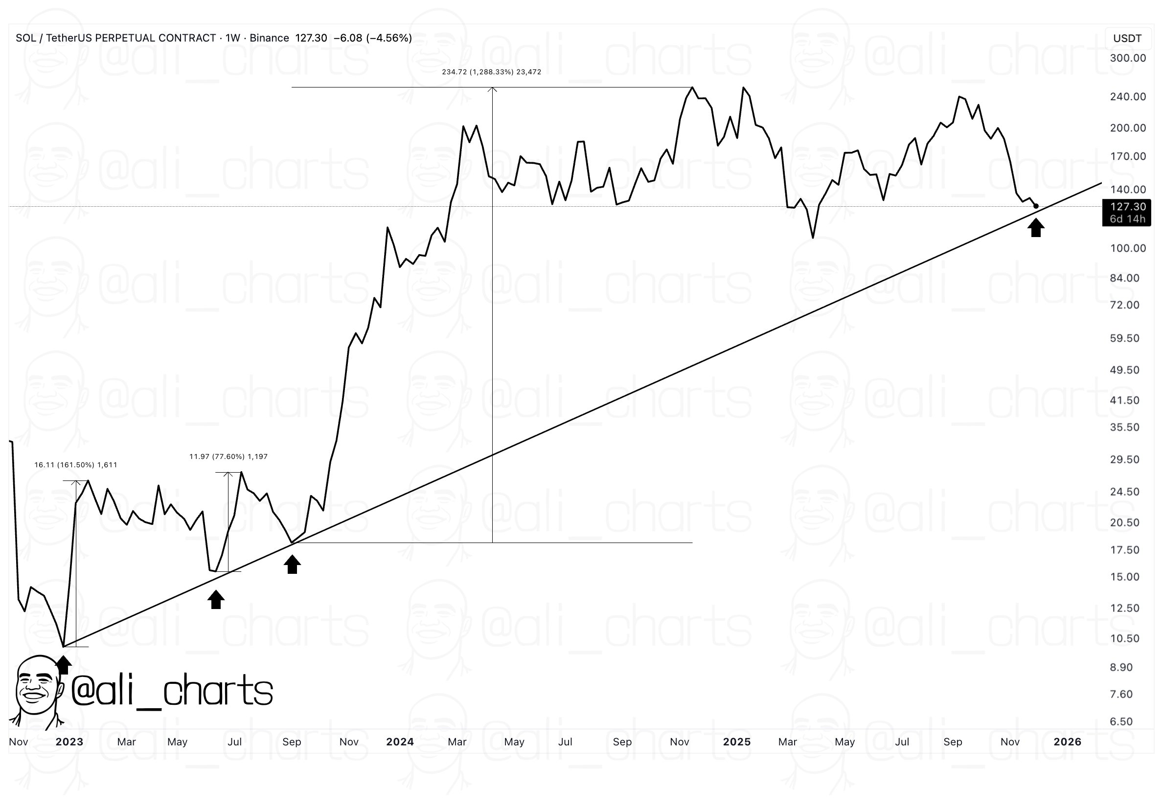 Ali Martinez points out something more serious. SOL Coin What will be the consequences of the end of the rise that started in 2023? SOL Coin is about to break the uptrend support line from 2 years ago.
