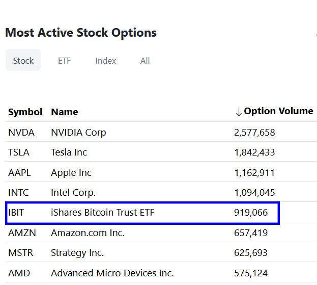 “Options tied to BlackRock’s Bitcoin ETF are the 5th most active of ALL options by volume. Just 1 year after launch, they have already outperformed some of the most popular options names on the market. Notably, they have outperformed options on Gold ETFs.” -Nic