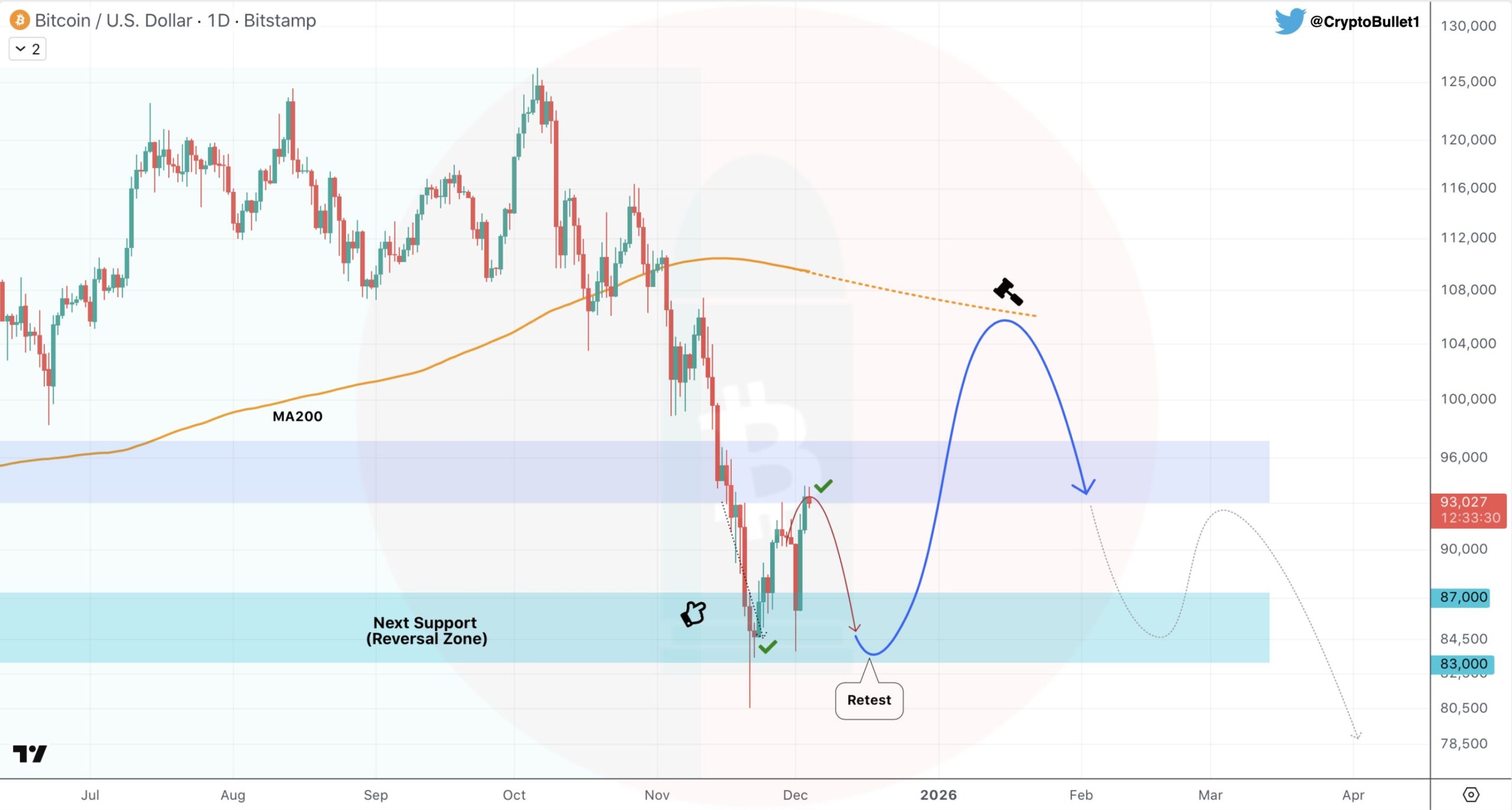 Roman Trading and many analysts who maintain bearish psychology BTC price It is waiting for the ongoing consolidation process to end. The bounce from the bottom may continue up to $104,000, but what they predict is that the decline will not stop until the new annual bottom. CryptoBullet shared the chart below a few hours ago and wrote that we will see a new test to $ 85 thousand and then a reaction rise to $ 104 thousand. His ultimate goal, too, is a deeper bottom.